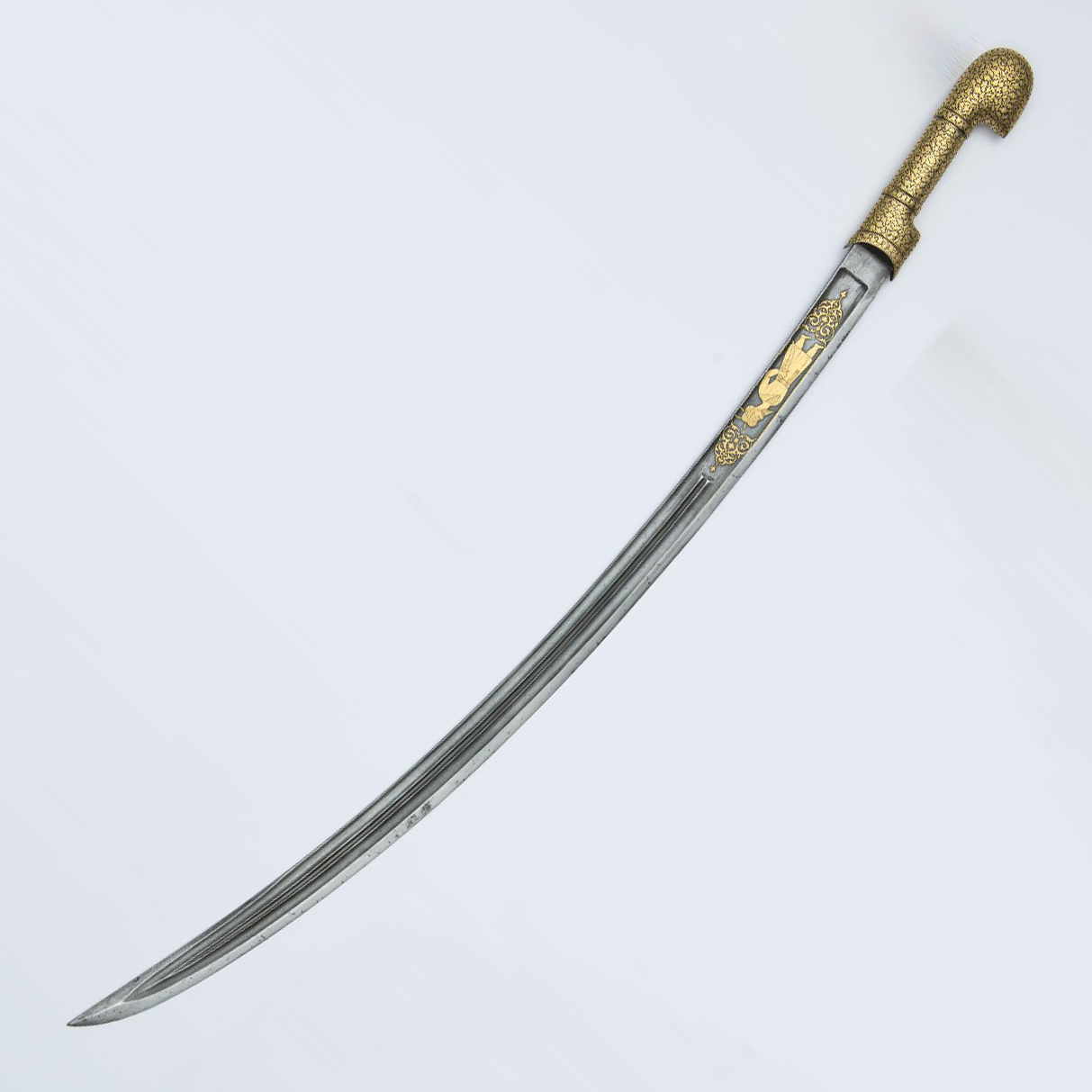 Кубачинская шашка конца XIX – начала ХХ века из стали и железа сплошь декорирована узором. Мельчайшие стебли с листьями и цветами нанесены на ножны и ручку методом золотой насечки. 100-сантиметровое изделие завершается великолепно украшенной гравировкой рукоятью. Клинок украшает фигура кавказского мужчины в национальном одеянии.