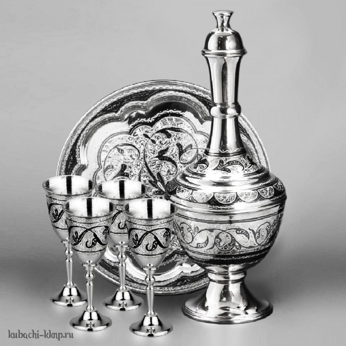 | Параметры: | Высота: 24,5 см графин и 10,5 см рюмки, Диаметр: 18 см поднос, Объем: 450 мл графин и 45 мл рюмки, |