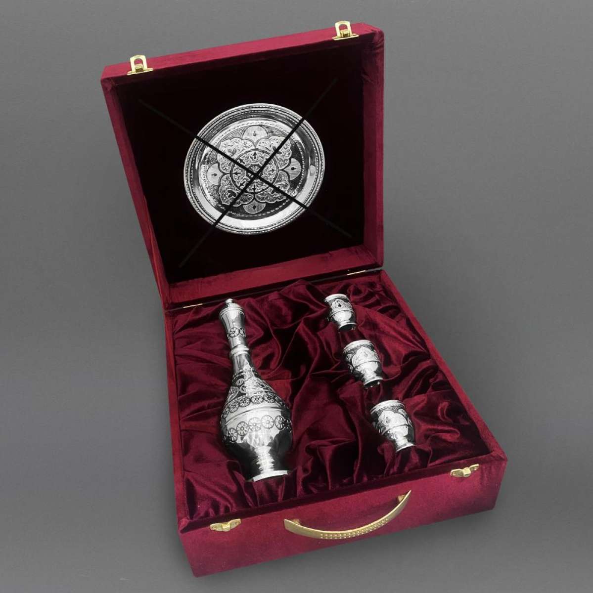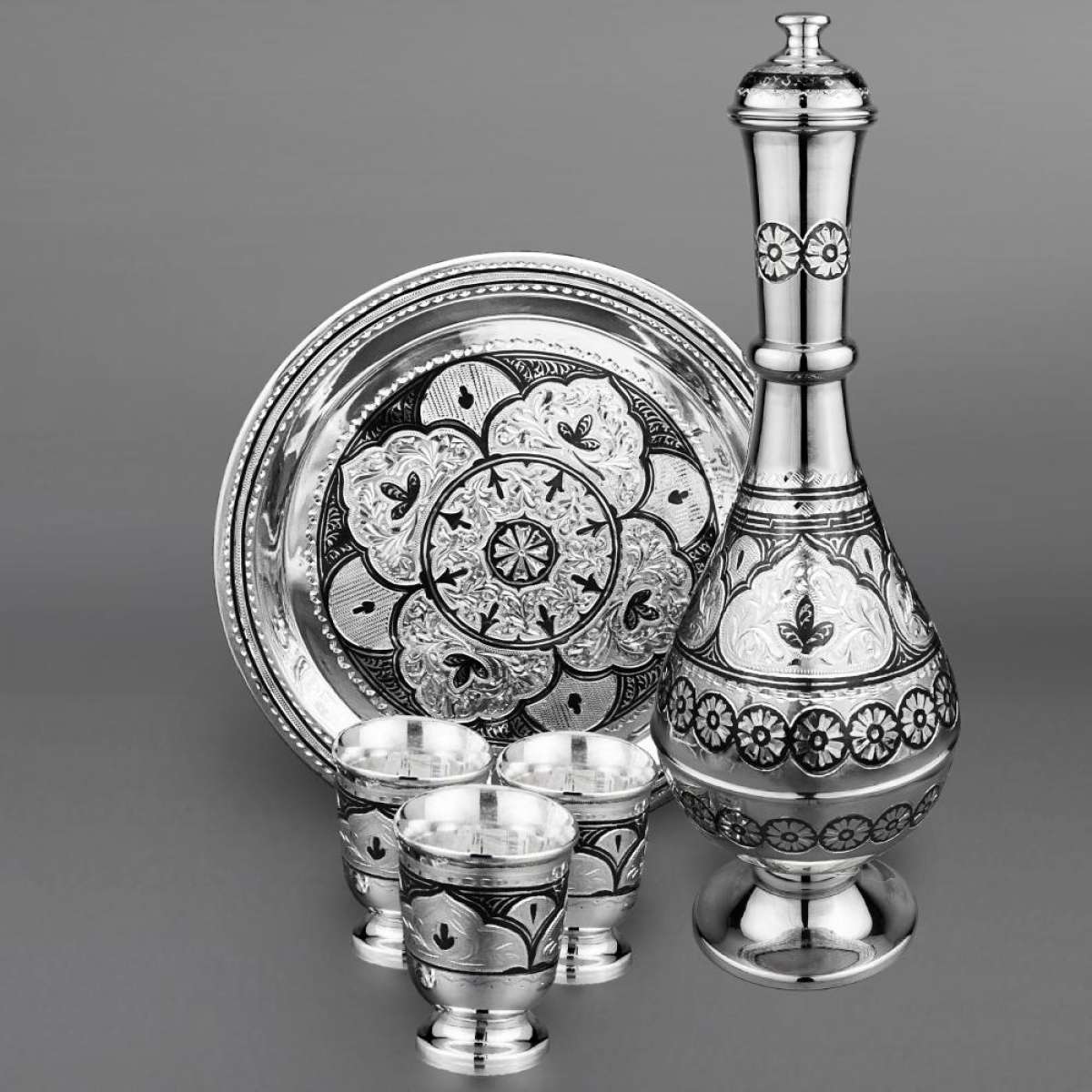 | Параметры: | Высота: 24 см графин и 5 см стопки, Диаметр: 18,5 см поднос, Объем: 250 мл графин и 40 мл стопки, |