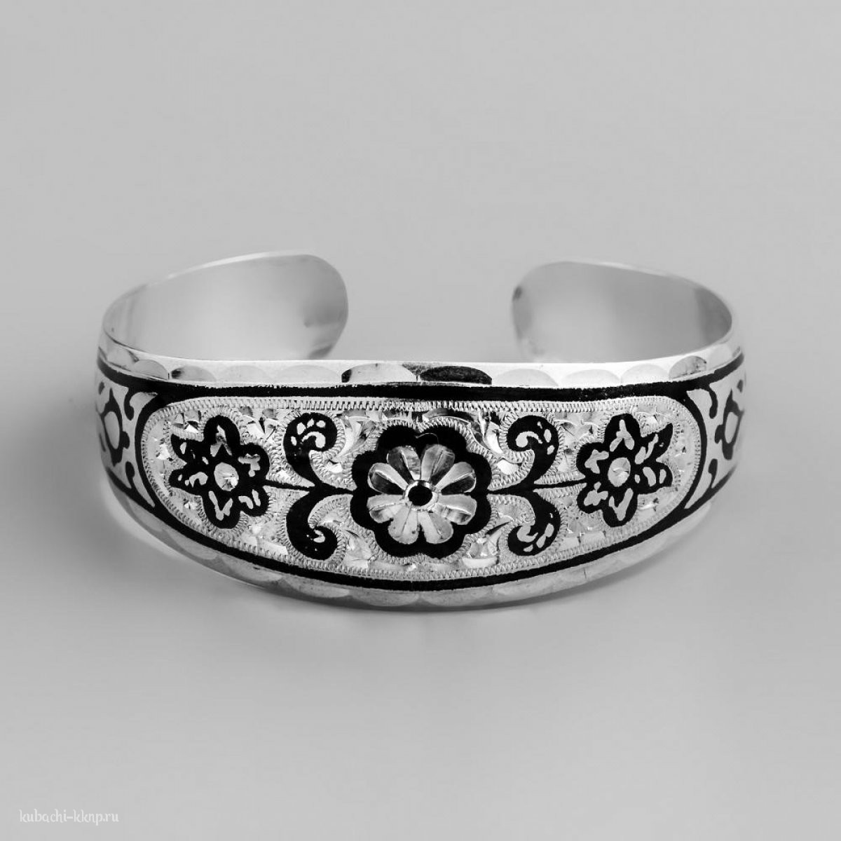 • Разношрокий серебряный браслет Кубачи с цветочным чернением - БР53