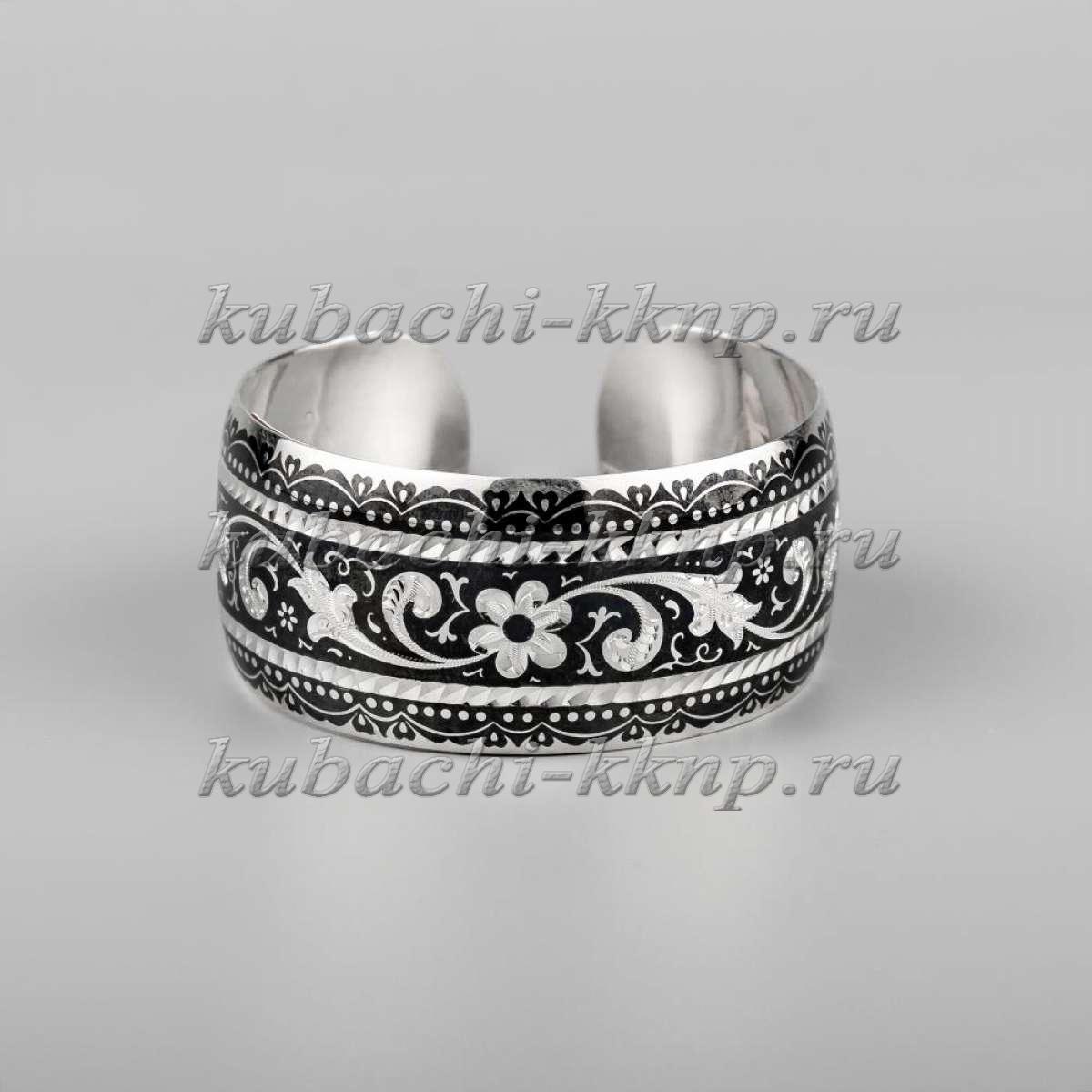 Кубачинский браслет из серебра с темным фоном и цветочным орнаментом, бр191