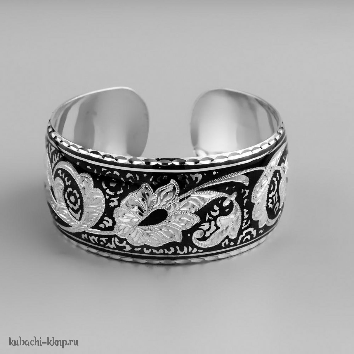 Кубачинский браслет из серебра с темным фоном и цветочным орнаментом - бр191