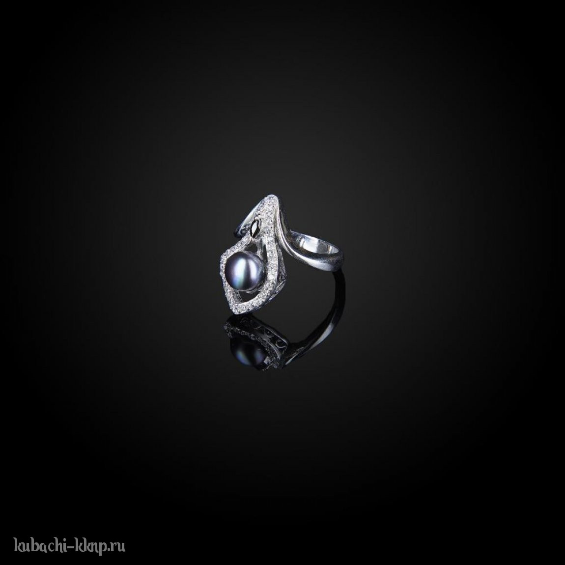 Серебряное кольцо Кубачи с фианитами и искусственным черным жемчугом, к817