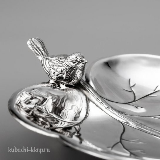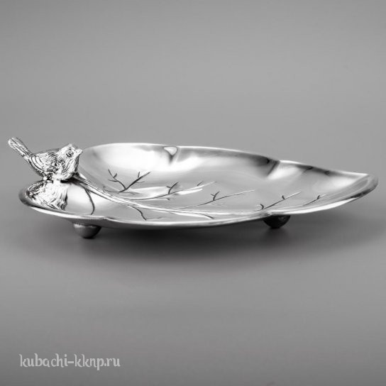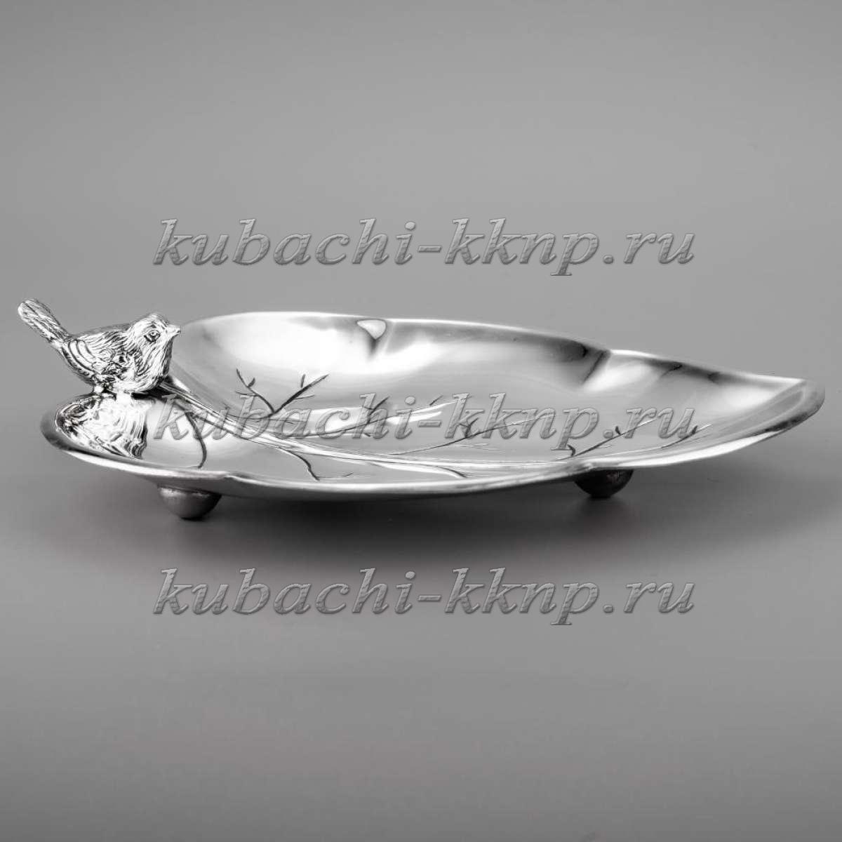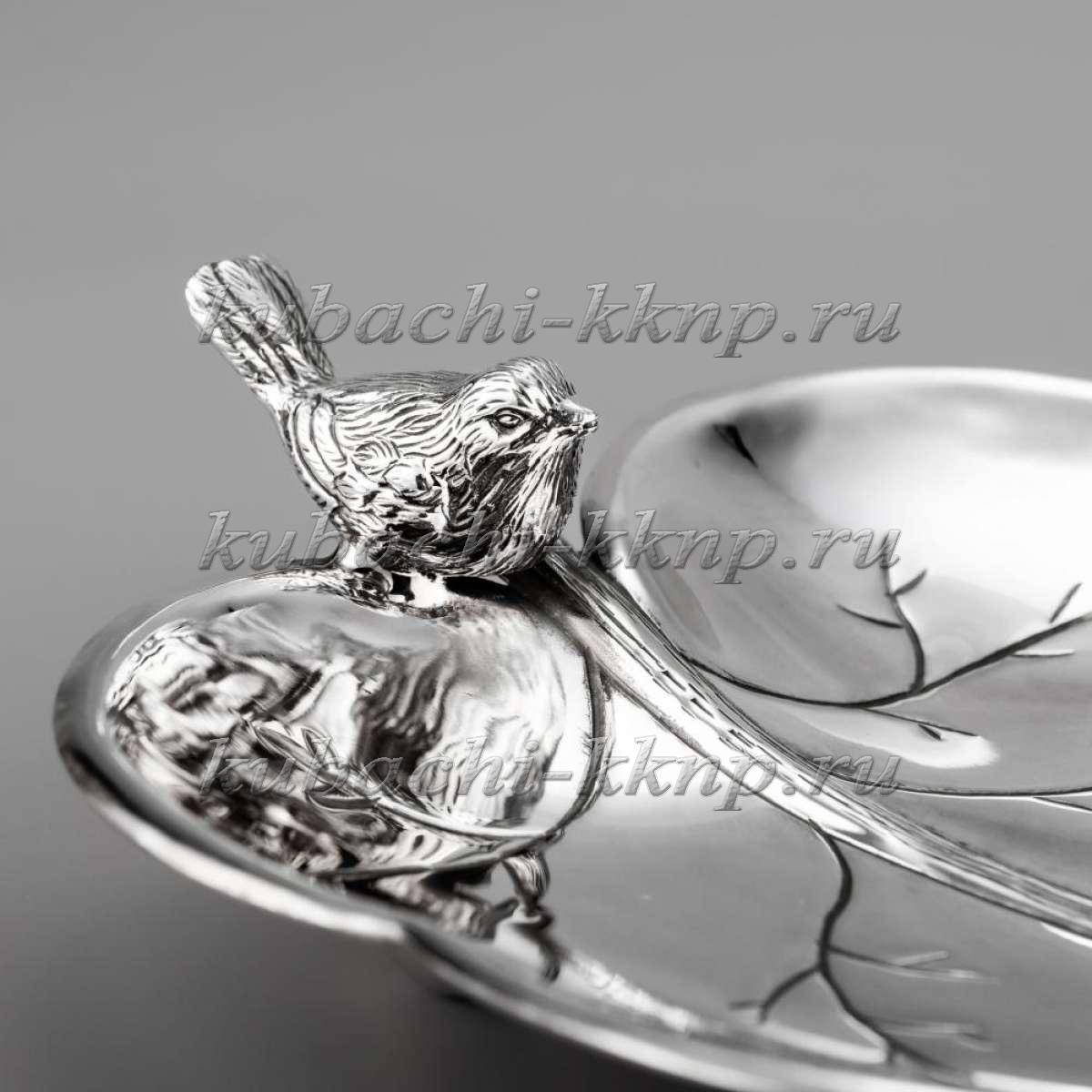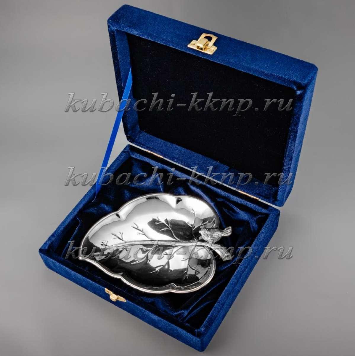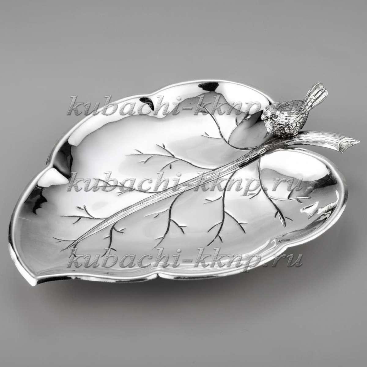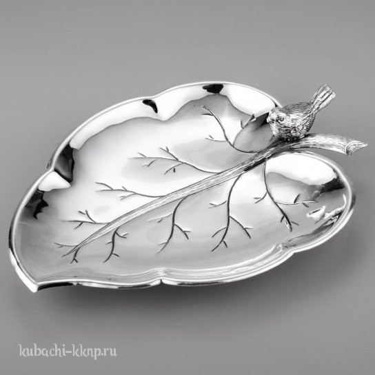 Серебряная конфетница «Липовый лист» с птичкой, КФ240