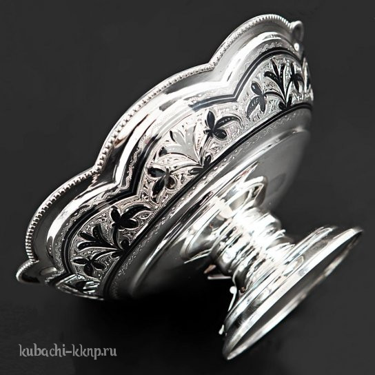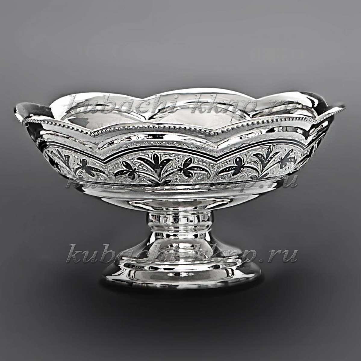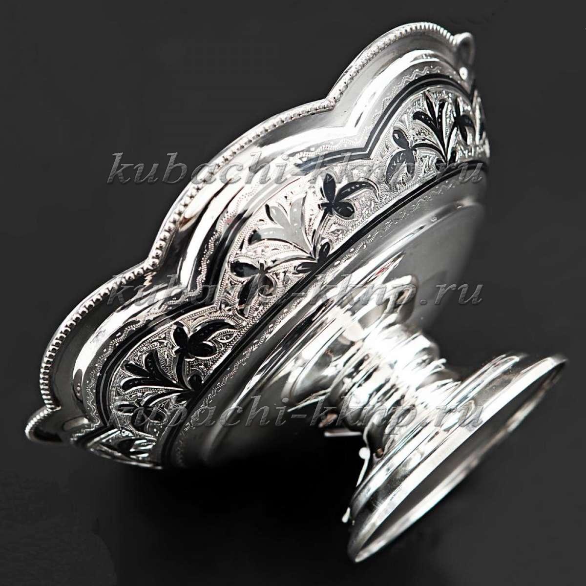 Серебряная конфетница на низкой ножке с кубачинским рисунком, кф00024