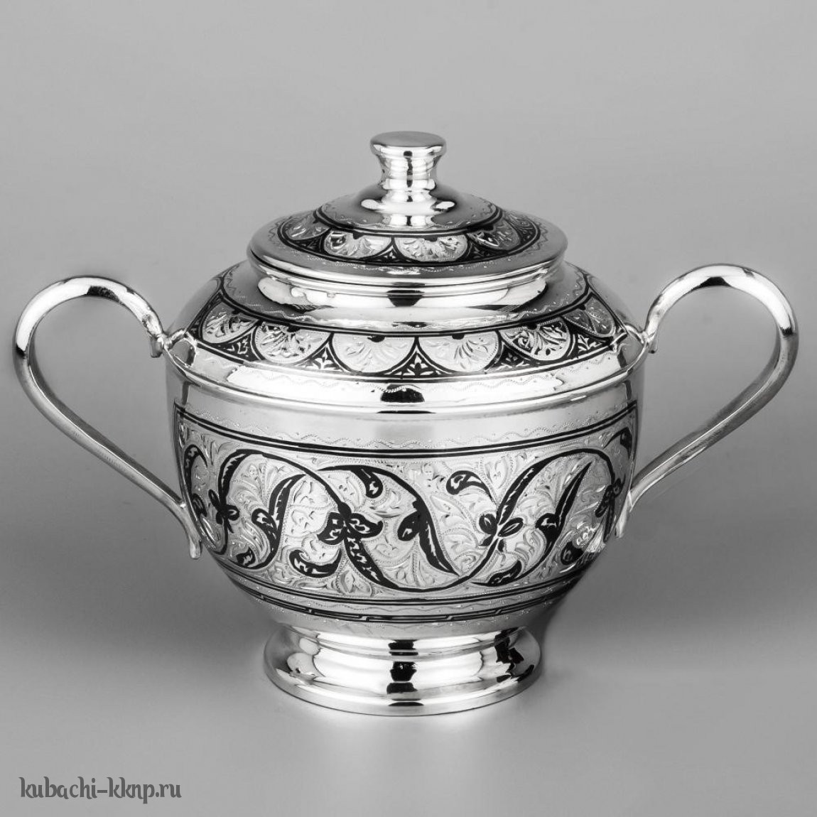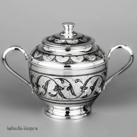 Серебряная сахарница с ручками и кубачинским орнаментом - СХ094