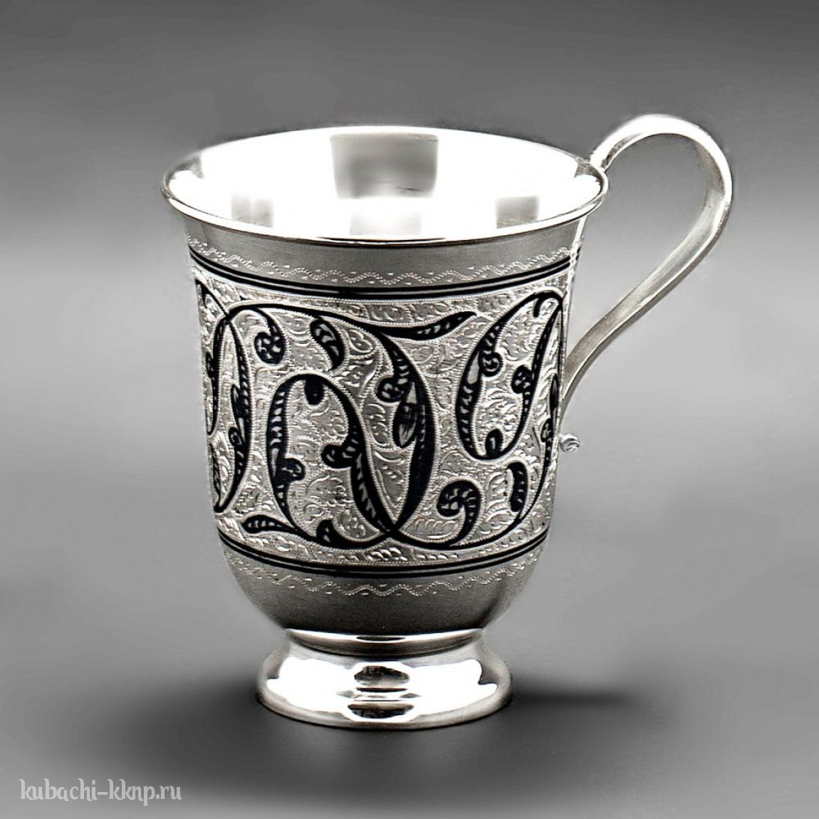 Кружка из серебра с лазерной гравировкой и красивой ручкой, 370 мл - кр10