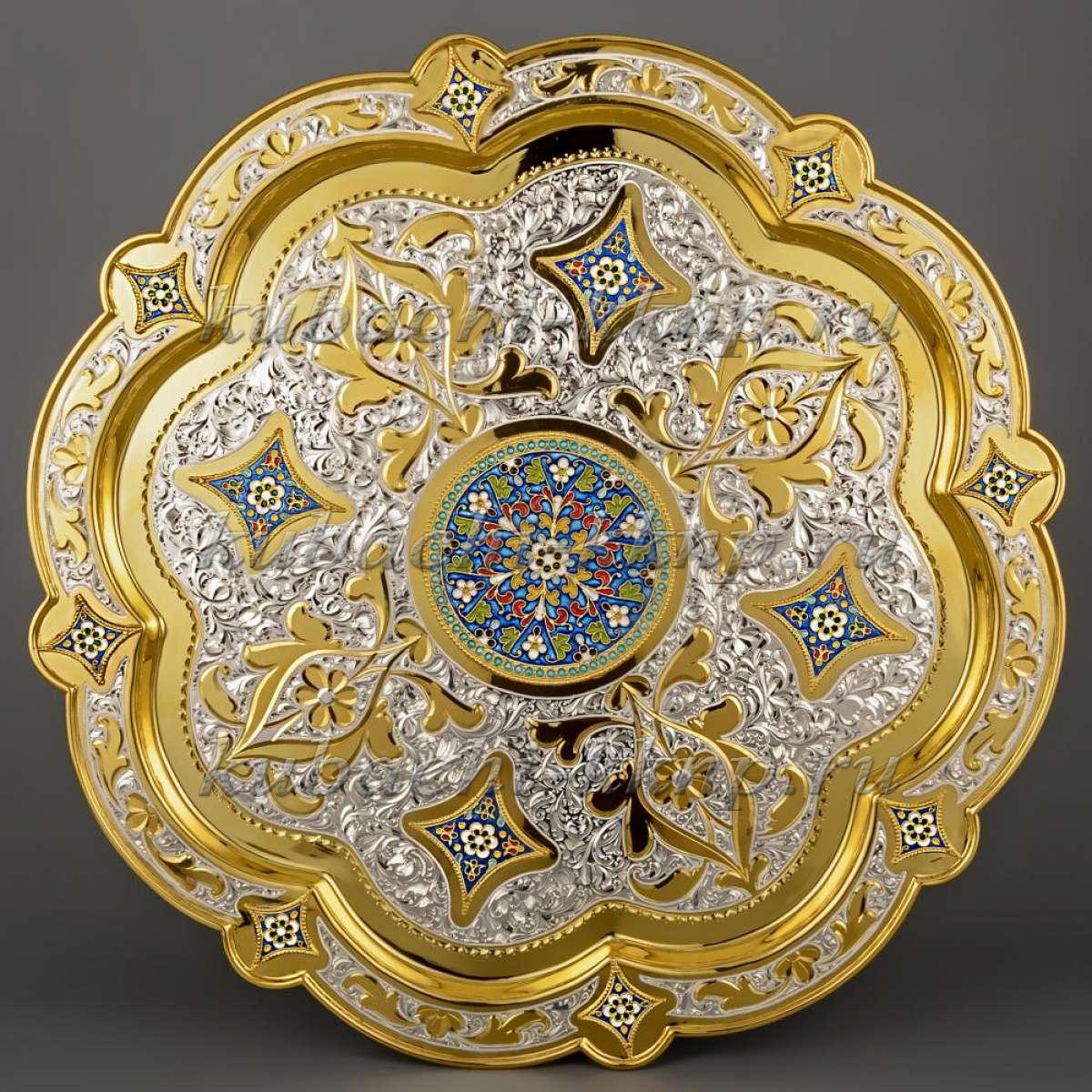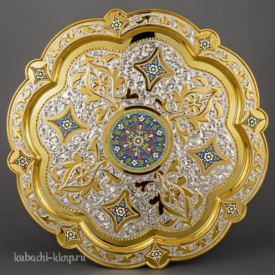 Поднос серебряный с вставками эмали и позолотой, пдн025