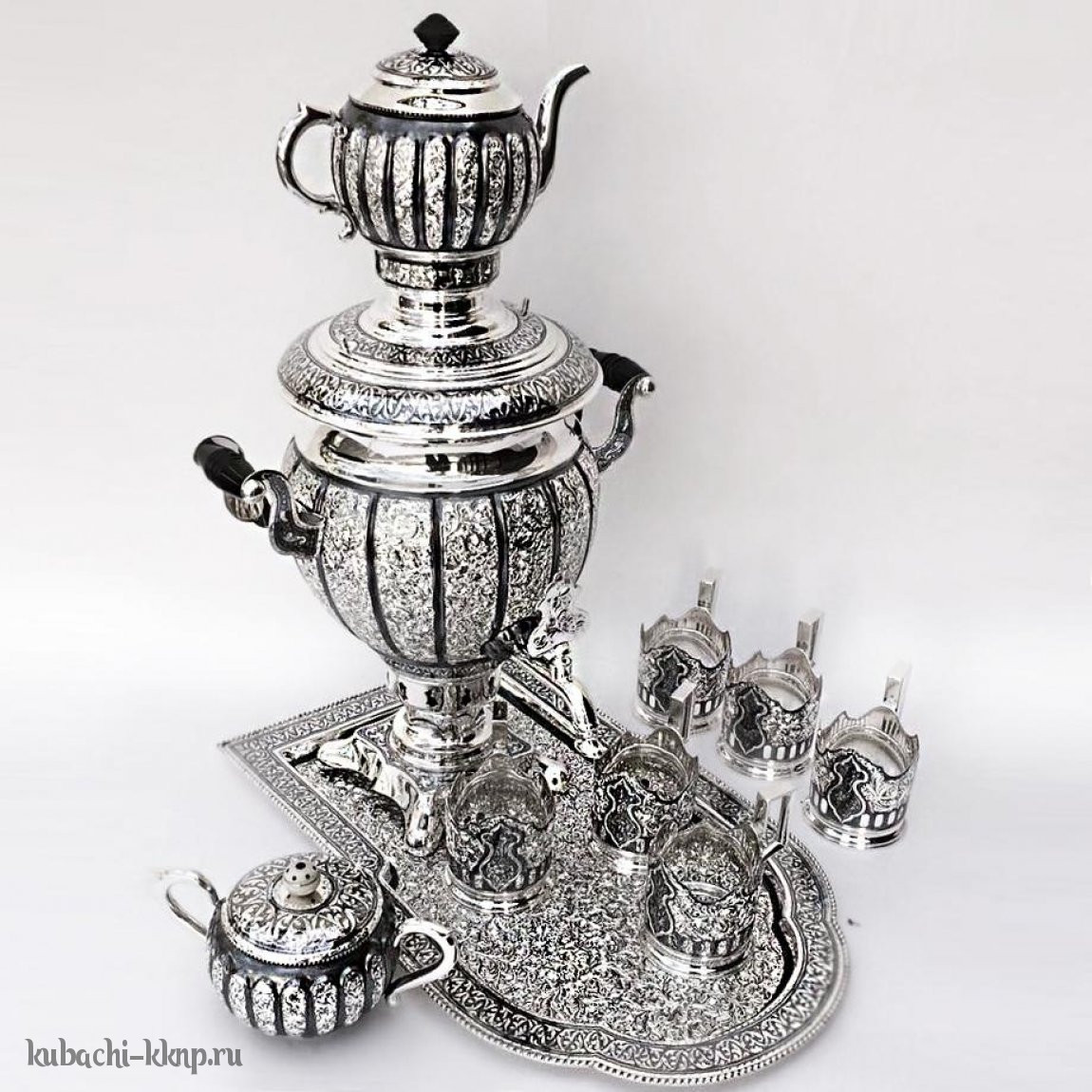 Серебряный самовар на подносе электрический