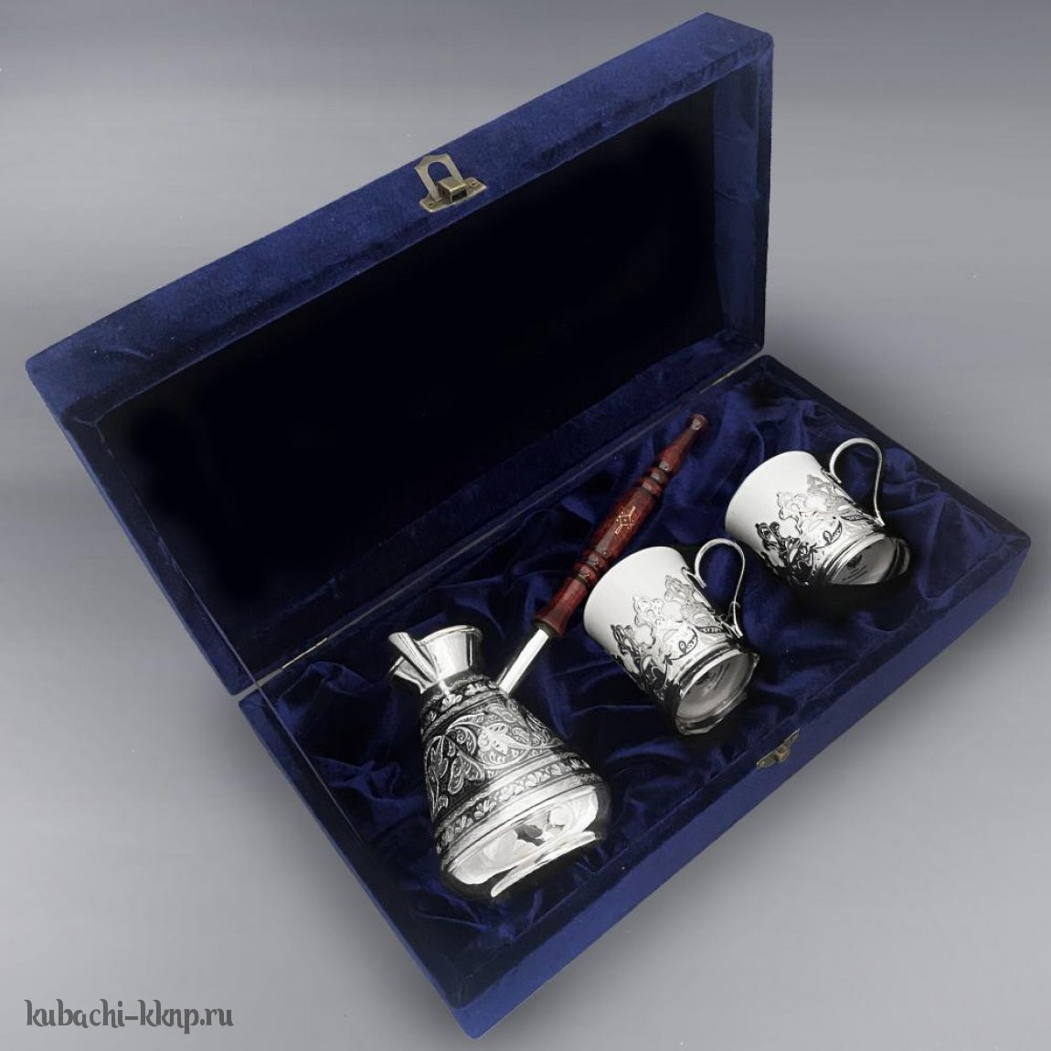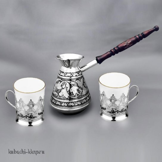 | Параметры: | Высота: 10,5 см турка и 6,5 см подстаканник, Объем: 250 мл турка и 80 мл подстаканник, Вставка: Фарфор (ЛФЗ), |