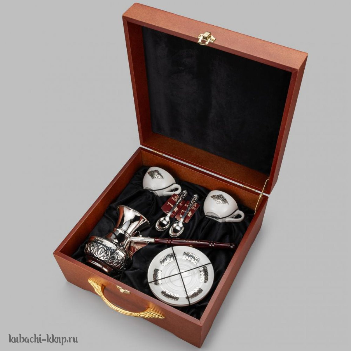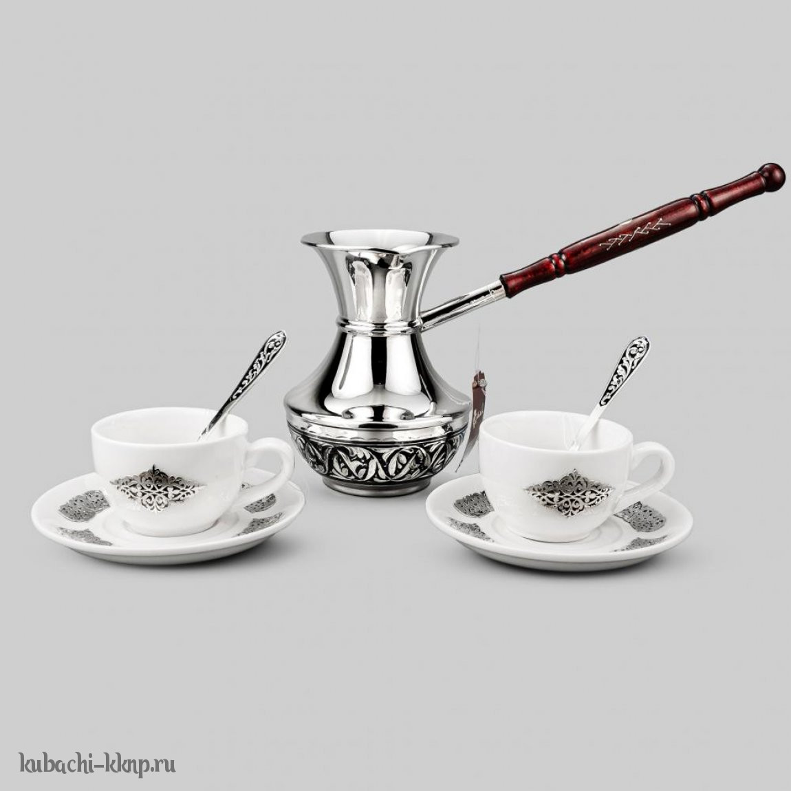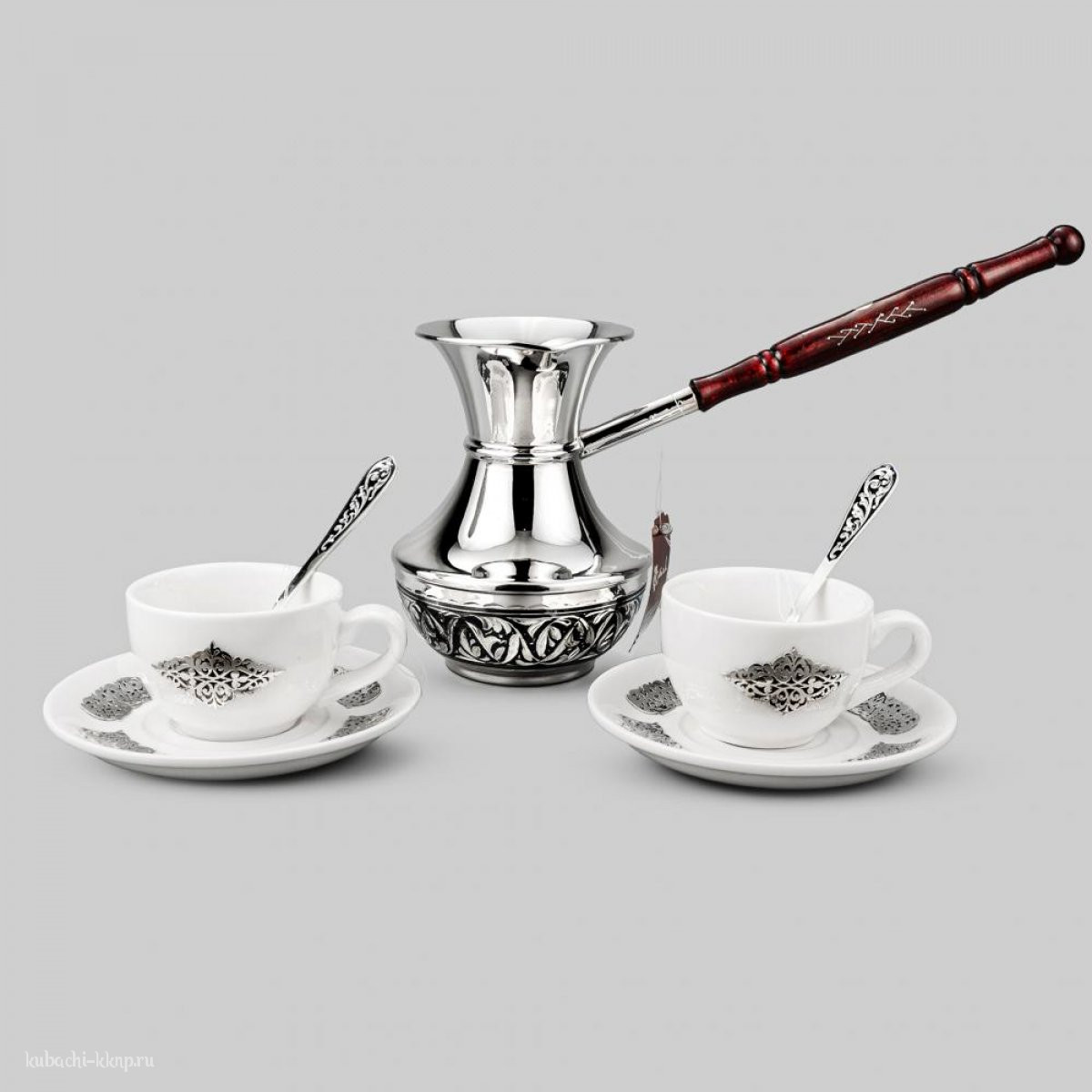 | Параметры: | Длина: 11,3 см ложка, Высота: 12 см турка и 4,5 см чашка, Объем: 400 мл турка и 90 мл чашка, Вставка: фаянс, |
