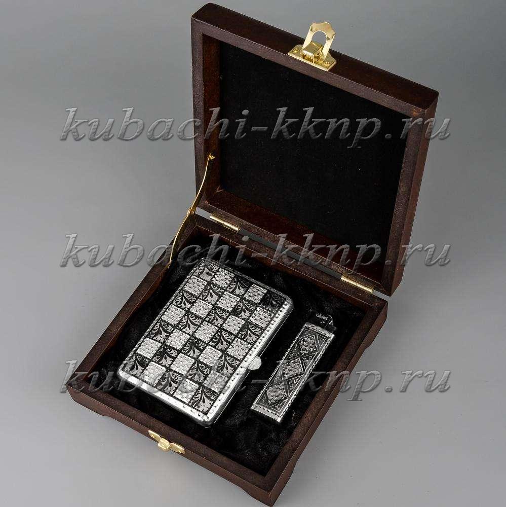 Серебряный портсигар с зажигалкой "Шахматный", пдс033з