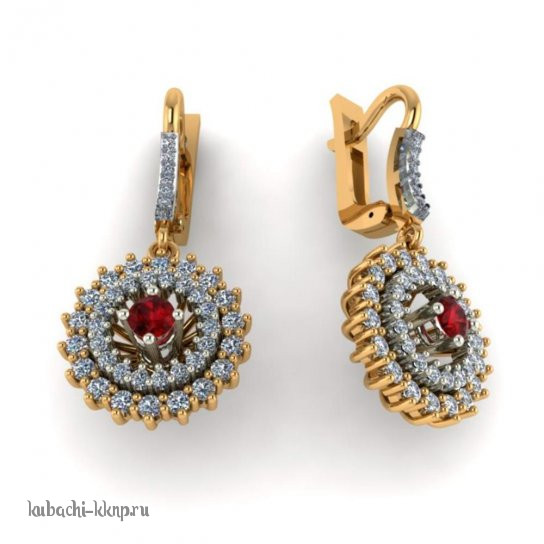 золотоые серьги с дорожкой фианитов и искусст. гранатом, 00109e